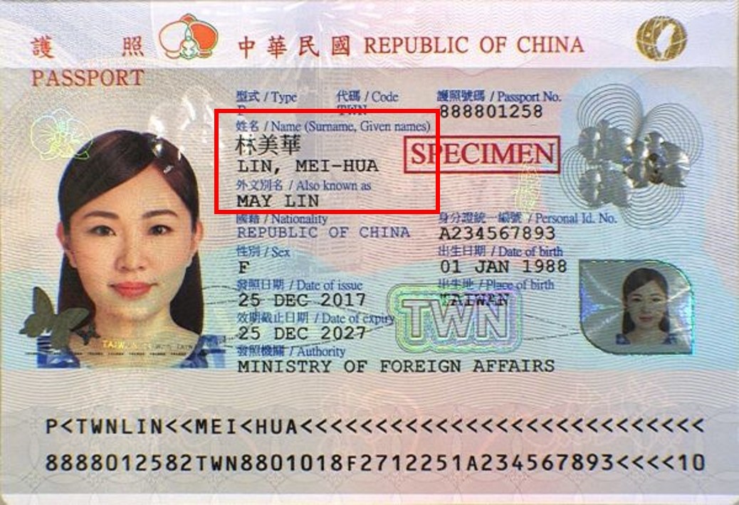 台灣的護照- 除了本來的姓名欄位之外,下面可以多一個別名。